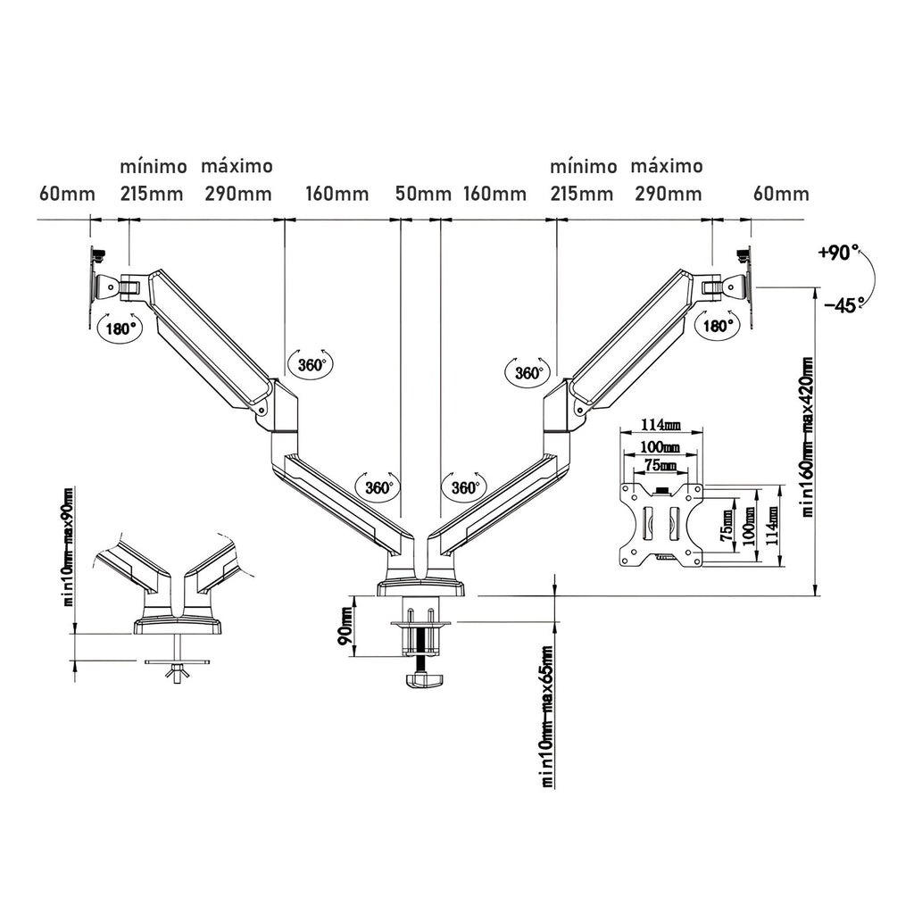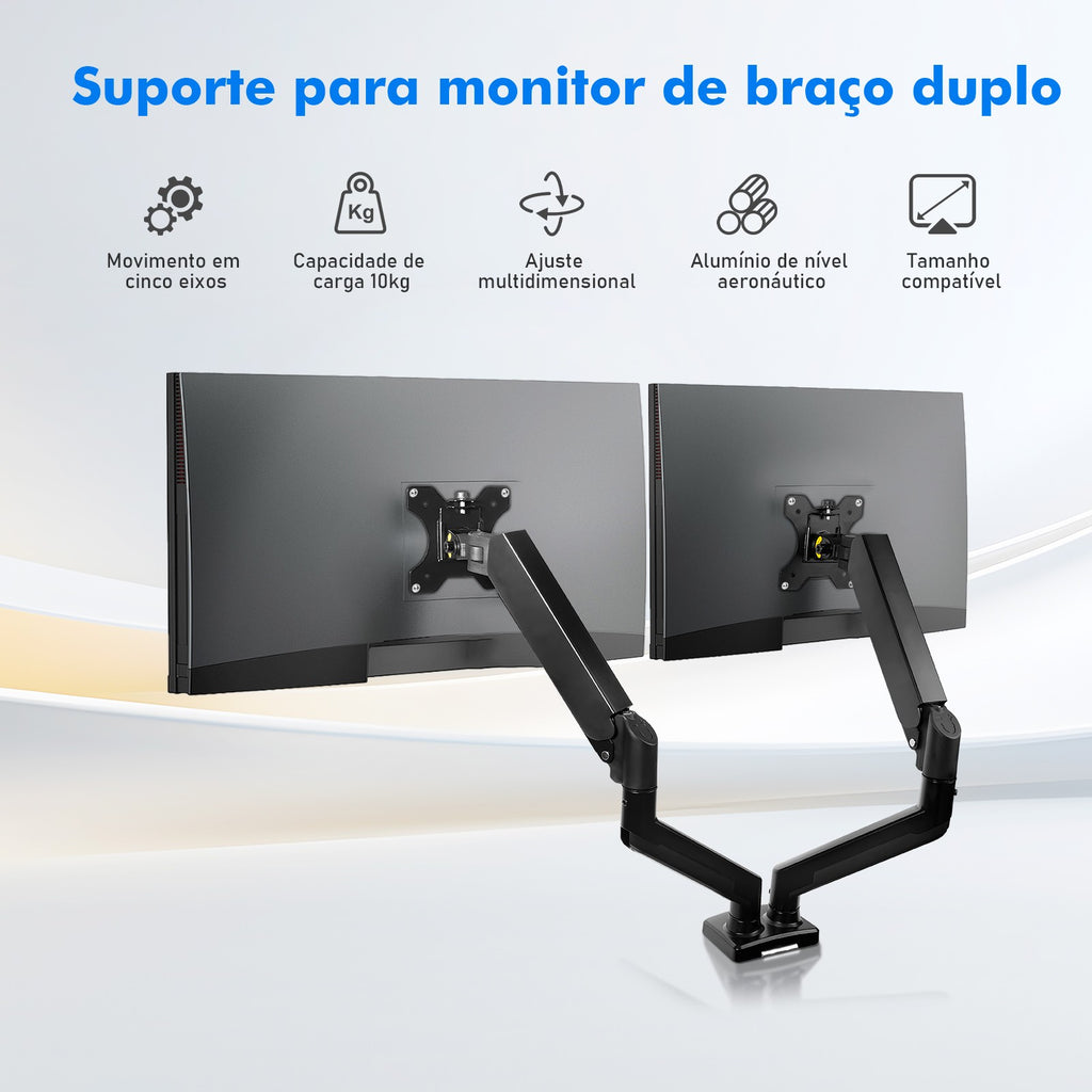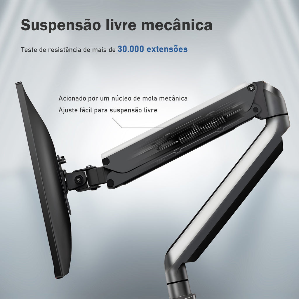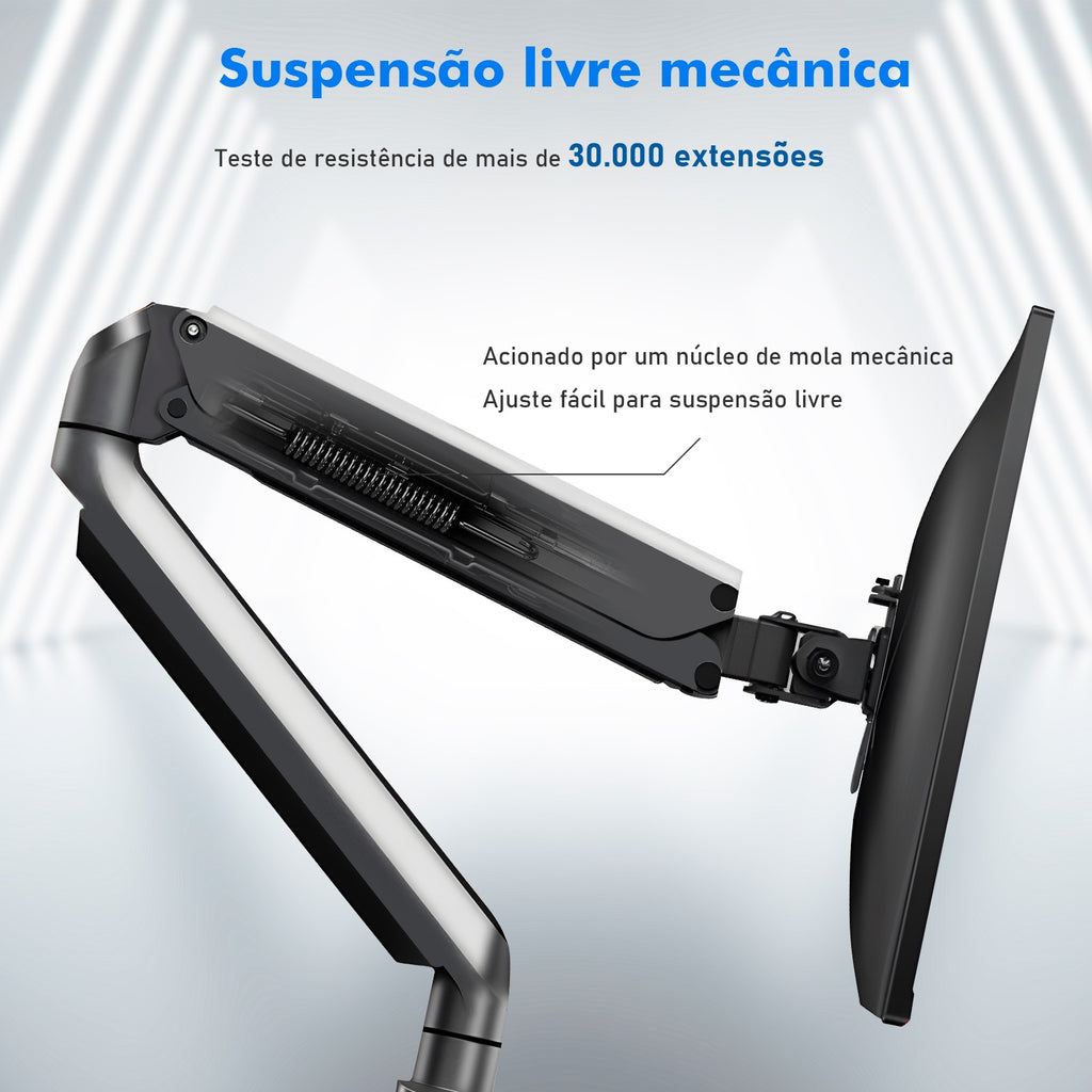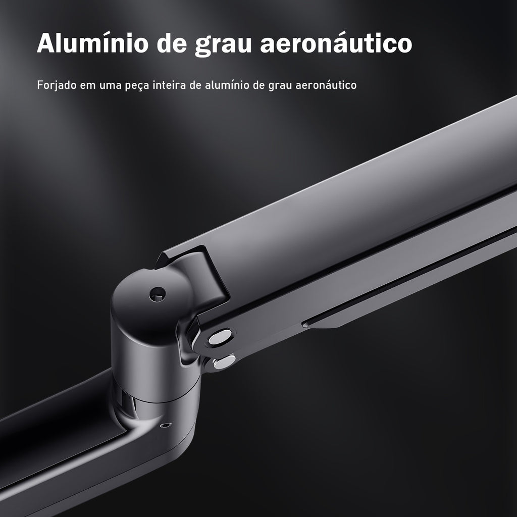 Construído com material resistente e acabamento robusto, o braço articulado assegura estabilidade e segurança ao monitor, evitando vibrações e quedas, além de proteger o equipamento ao longo do uso. Seu design funcional permite movimentos suaves em todas as direções, possibilitando ajustes de altura, rotação, inclinação, inclinação lateral e aproximar/afastar o monitor conforme o tipo de atividade. Isso melhora a postura ao trabalhar, reduz cansaço no pescoço e impede acúmulo de objetos sobre a mesa, deixando o setup mais limpo e organizado.